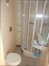Vorraum mit Küchenzeile Bad mit Dusche, Waschtisch und WC, heller Wohn- Schlafraum
