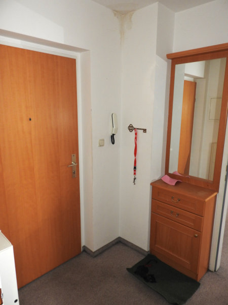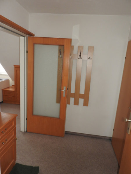 Vorraum mit Garderobe, Bad mit Wanne, Waschtisch, Waschmaschine und WC, heller und gemütlicher Wohn- Schlafraum